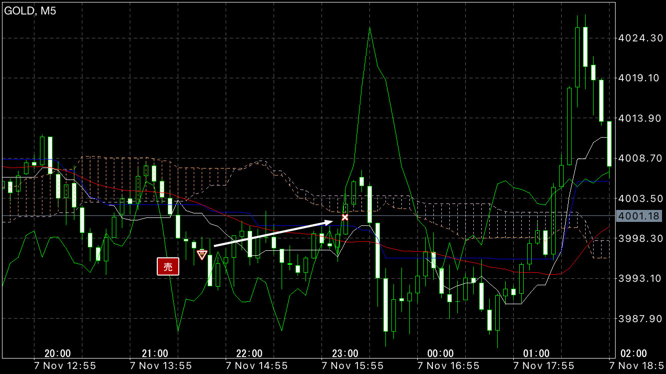 しかしトレンドならずでMA越えて損切り。